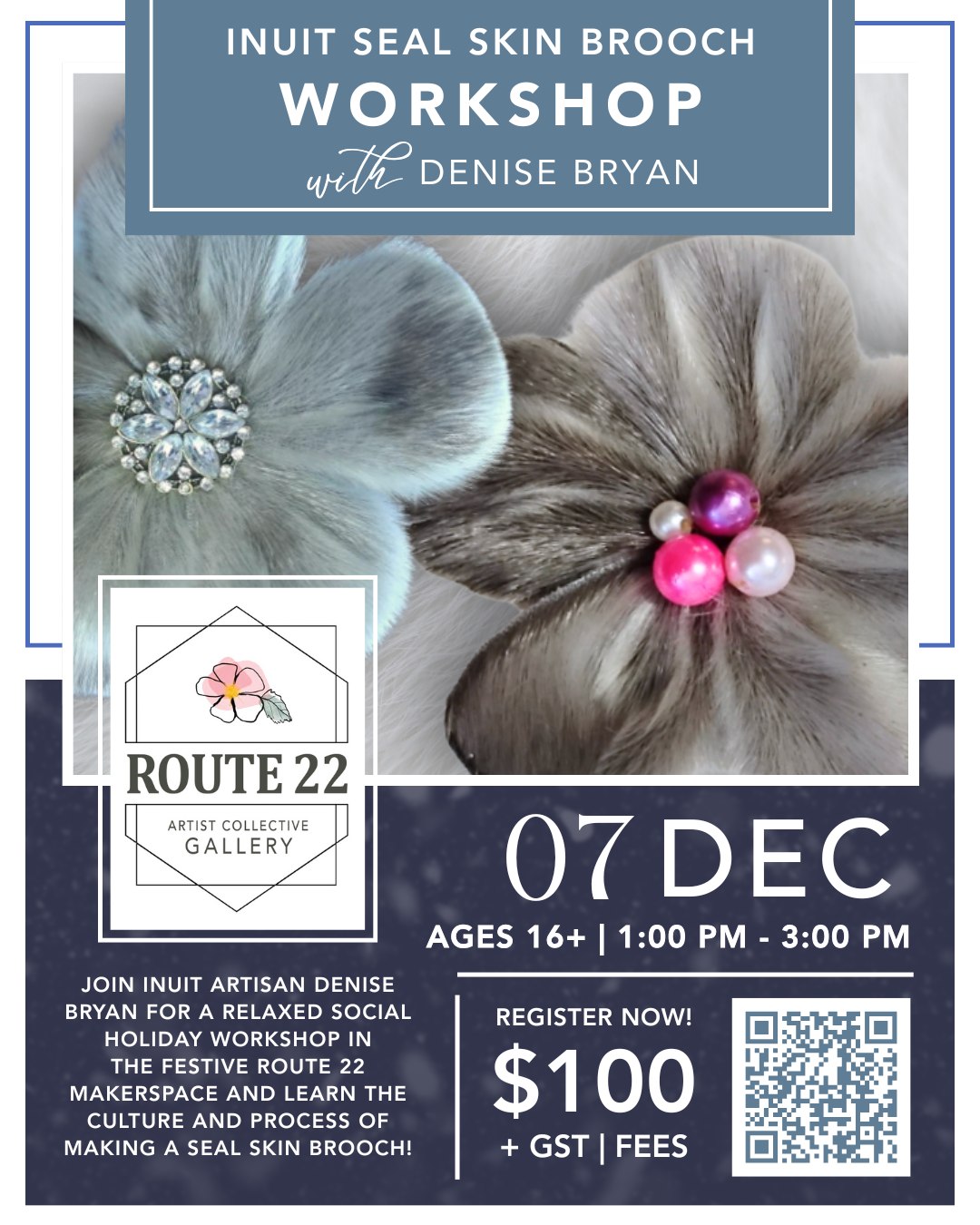 Seal Skin Brooch Workshop! Join local Inuit artisan Denise Bryan and learn the culture and process of making a seal skin brooch! Enter into Route 22 Gallery's festive makerspace for this relaxed…